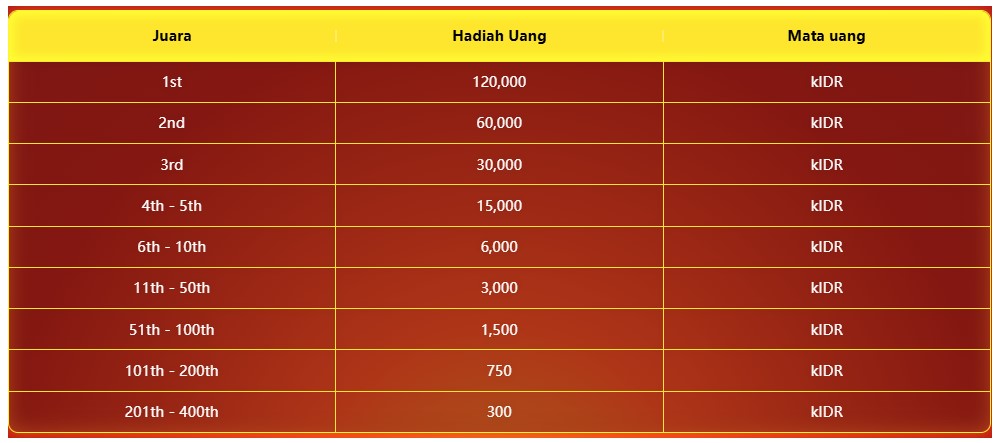 2. Total Hadiah Event ini adalah sebesar Rp 8.560.500.000 yang akan dibagikan kepada seluruh pemenang Tournamen