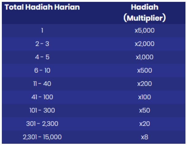 5. Setiap hadiah akan memberikan hingga Rp 5.000.000; Rp 4.000.000; Rp 3.000.000; Rp 1.000.000; Rp 500.000; Rp 300.000; Rp 100.000; 100 Free Spins; 50 Free Spins atau 20 Free Spins yang dapat dimainkan di permainan yang memenuhi syarat selama periode promosi.